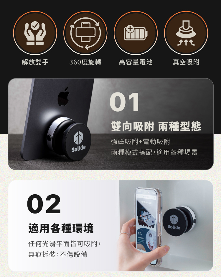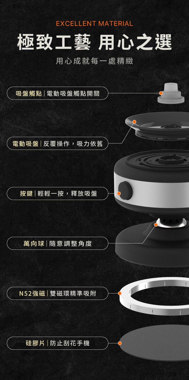 真空吸附與電動排氣功能,穩固可靠,不易脫落。專為手機設計 ,強力磁鐵吸附。智能感應提供高效吸附,搭配自動排氣技術, 操作更加流暢,日常使用更舒適,讓科技與便利完美結合。