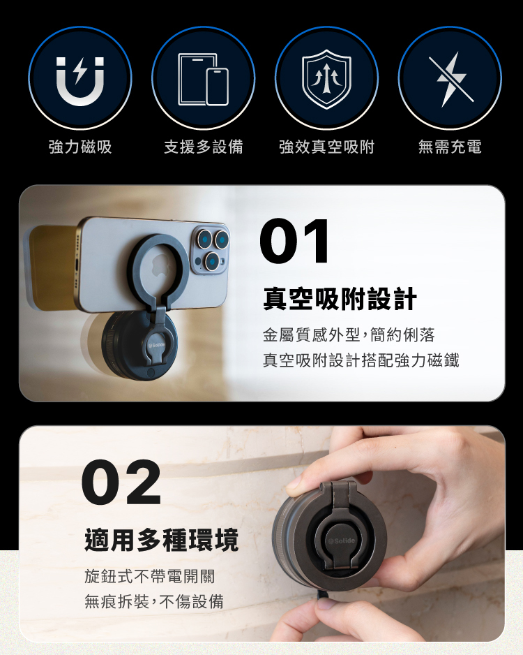 內建旋轉鎖設計,無需需電源、重複使用不傷表面。
