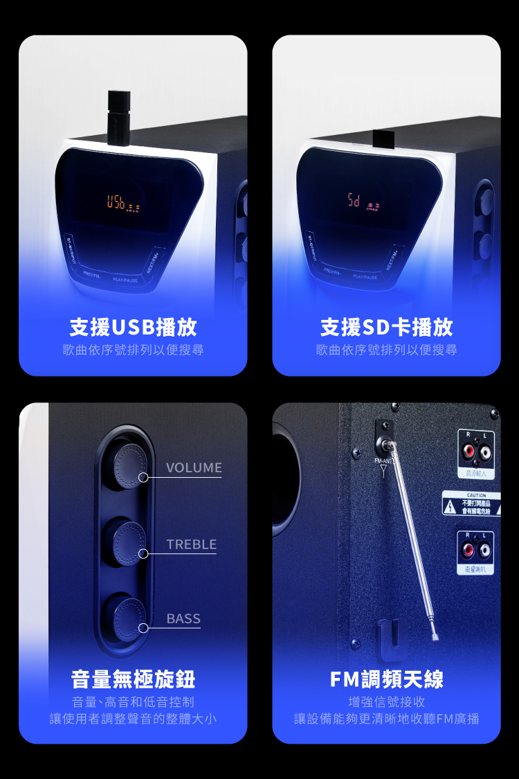 6. Function/控制功能:電源開關/高音/低音/音量調整/遙控器